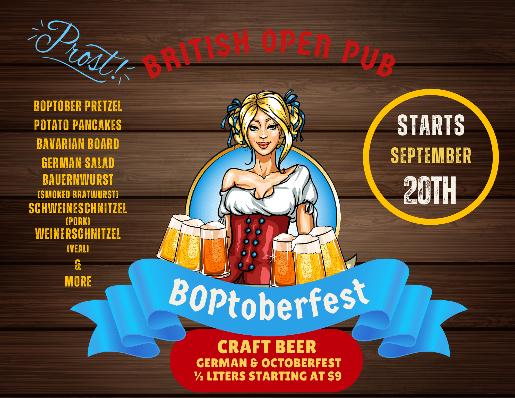 BOPtoberfest Menu Starts Enjoy authentic german favorites starting Sept 20th + Add to Google Calendar + iCal / Outlook export Date Sep 20 2025 Expired! Time 8:00 am - 6:00 pm Share this event SearchSearchRecent PostsMusic Schedule Recent CommentsNo comments to show.