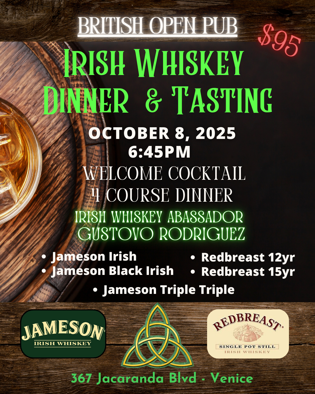 Join us on Wednesday October 8th for Irish Whiskey Dinner & Tasting featuring; Jameson Irish Whiskey, Jameson Black Irish Whiskey, Jameson Triple Triple, Redbreast 12 yr and Redbreast 15yr.