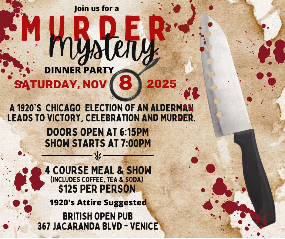 Please join us on November 8, 2025 for an evening set in 1920’s Chicago where the election of an Alderman leads to victory, celebration and murder!! Seating begins at 6:15pm, program begins at 7pm!!