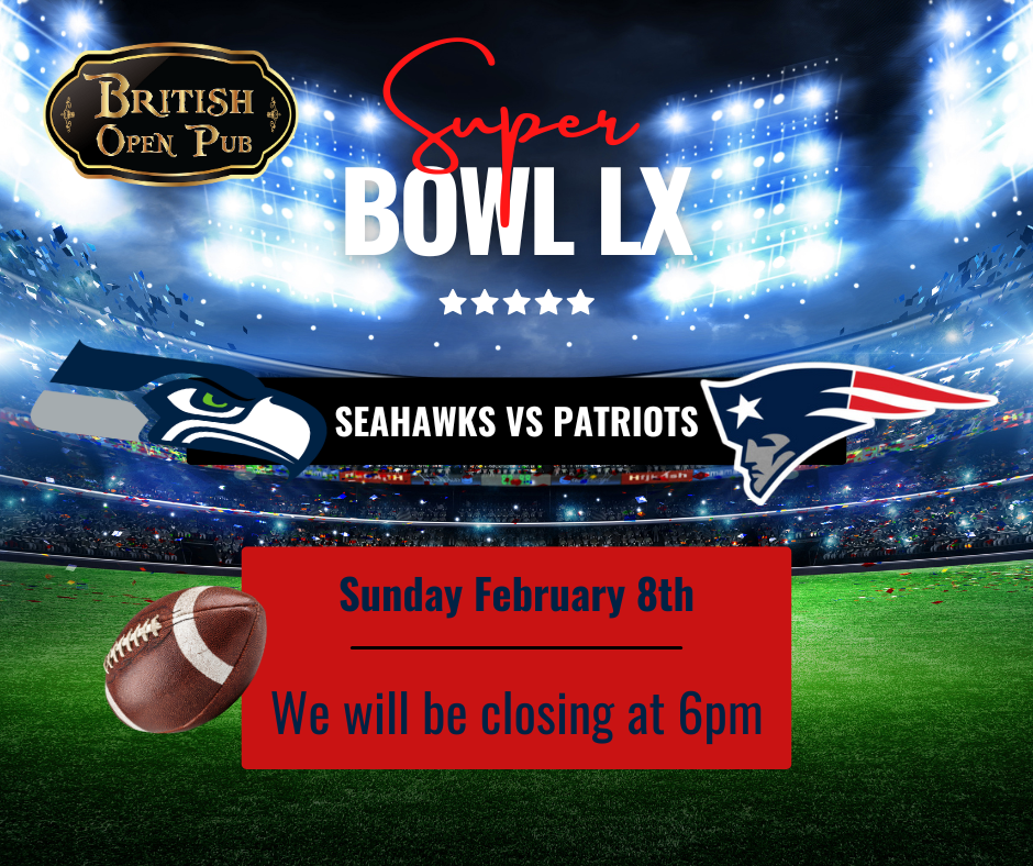 Super Bowl Sunday Hours 11am to 6pm + Add to Google Calendar + iCal / Outlook export Date Feb 08 2026 Expired! Time 11:00 am - 6:00 pm Share this event SearchSearchRecent PostsMusic Schedule Recent CommentsNo comments to show.