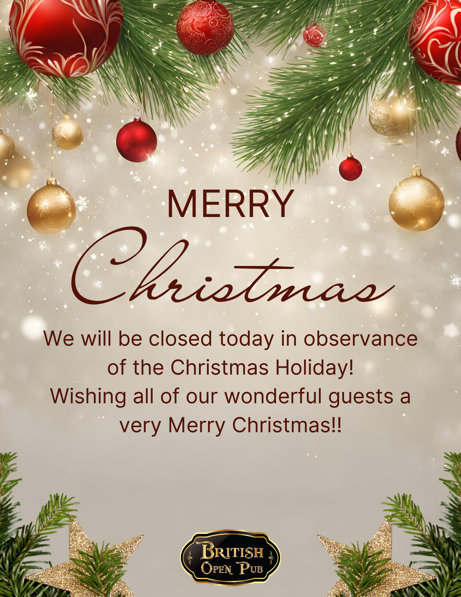 We will be closed today in observance of The Christmas Holiday! See you tomorrow for our regular business hours! + Add to Google Calendar + iCal / Outlook export Date Dec 25 2024 Expired! Time All Day Share this event SearchSearchRecent PostsMusic Schedule Recent CommentsNo comments to show.
